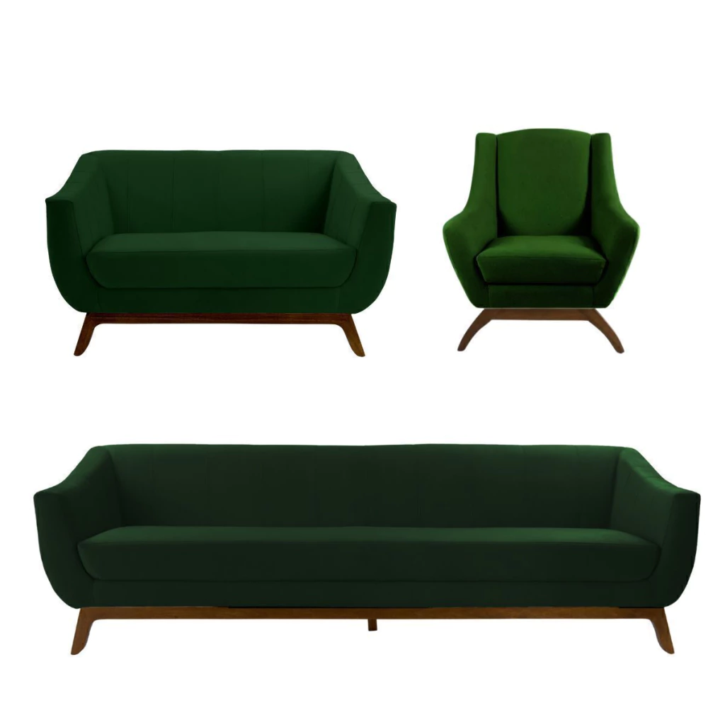 O Conjunto Athenas é composto por um sofá de 3 lugares, uma poltrona e uma charmosa namoradeira. Cada peça é revestida com tecido veludo, proporcionando um toque macio e aparência sofisticada.